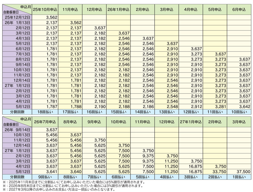 早期割引 | 一括払い : | 2025年11月末まで 10%割引 ( 33,750円 ) | 2026年8月末まで 5%割引 ( 35,625円 ) | 2026年11月末まで 3%割引 ( 36,375円 ) | *2026年12月以降割引なし |
