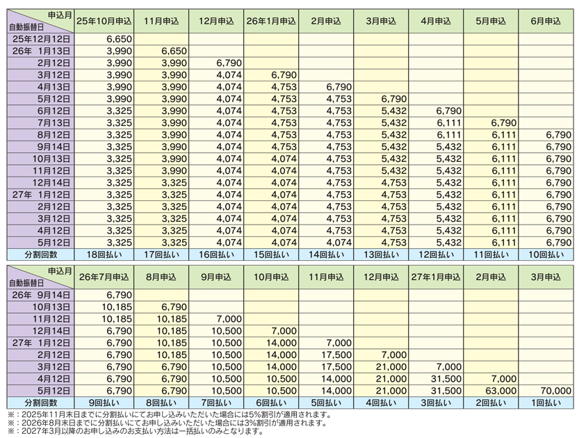 分割払い : | 2025年11月末まで 5%割引 ( 66,500円 ) | 2026年8月末まで 3%割引 ( 67,900円 ) | *2026年9月以降割引なし |