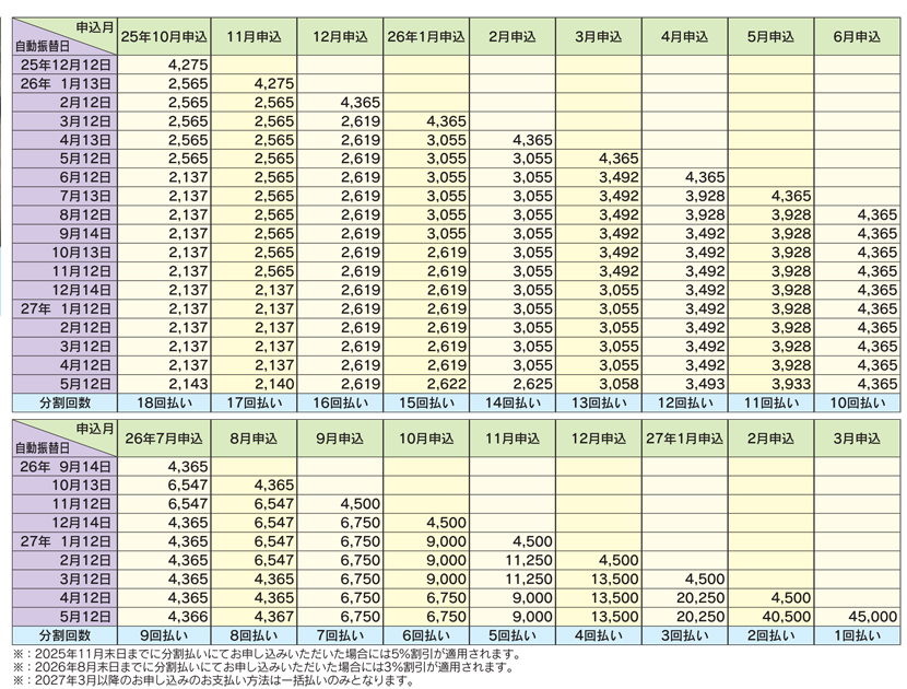 早期割引 | 一括払い : | 2025年11月末まで 10%割引 ( 40,500円 ) | 2026年8月末まで 5%割引 ( 42,750円 ) | 2026年11月末まで 3%割引 ( 43,650円 ) | *2026年12月以降割引なし |